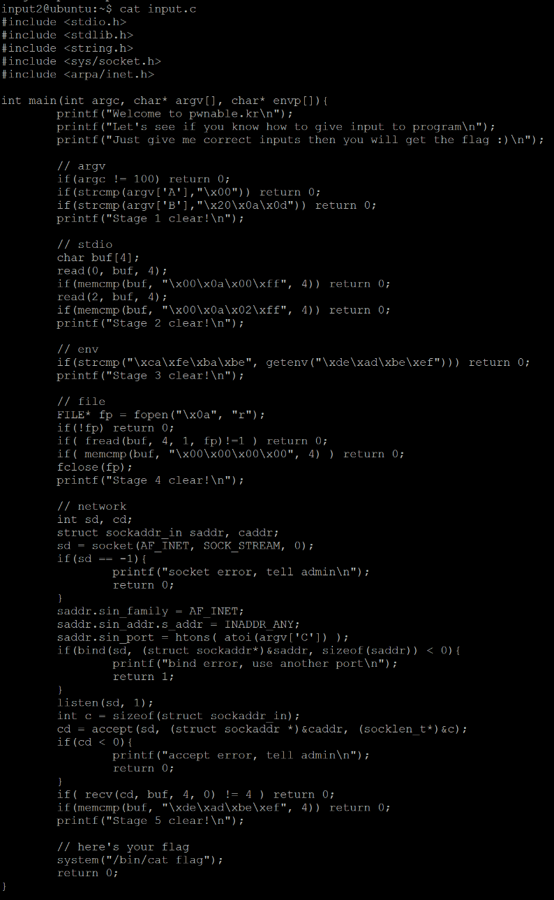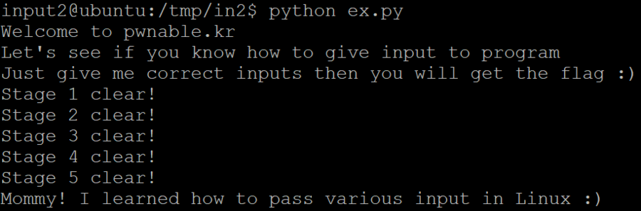 문제는 flag를 얻기 위해서는 system함수를 이용하여 /home/input2/flag 파일을 읽어야 하는데, 위치가 다르기 때문에 읽히지 않는다. 따라서 현재 디렉토리(/tmp/내가 만든 디렉토리)에 링크 파일을 만들어 주어야 한다.