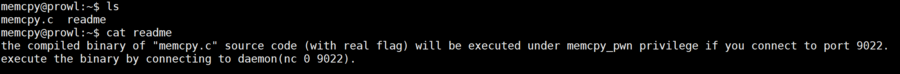 SSH로 접속하면 c파일과 readme 파일이 있다. readme 파일에서는 9022포트에 접속하라고 한다.