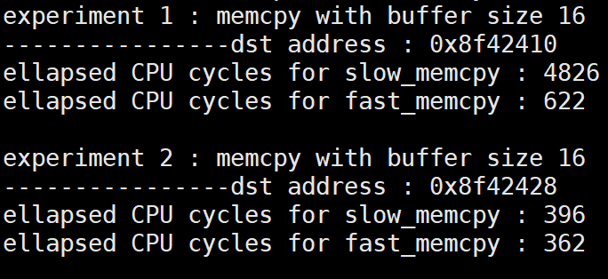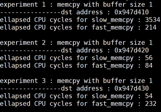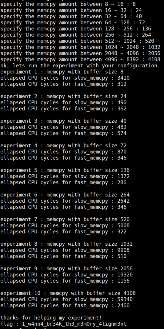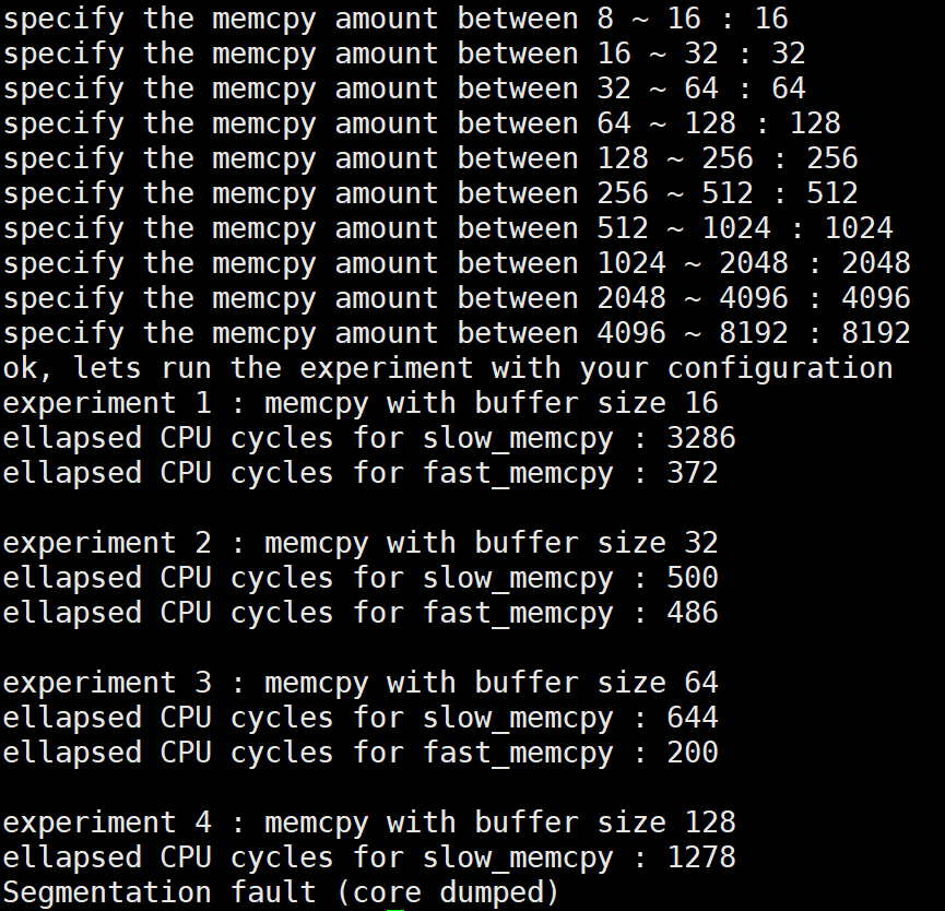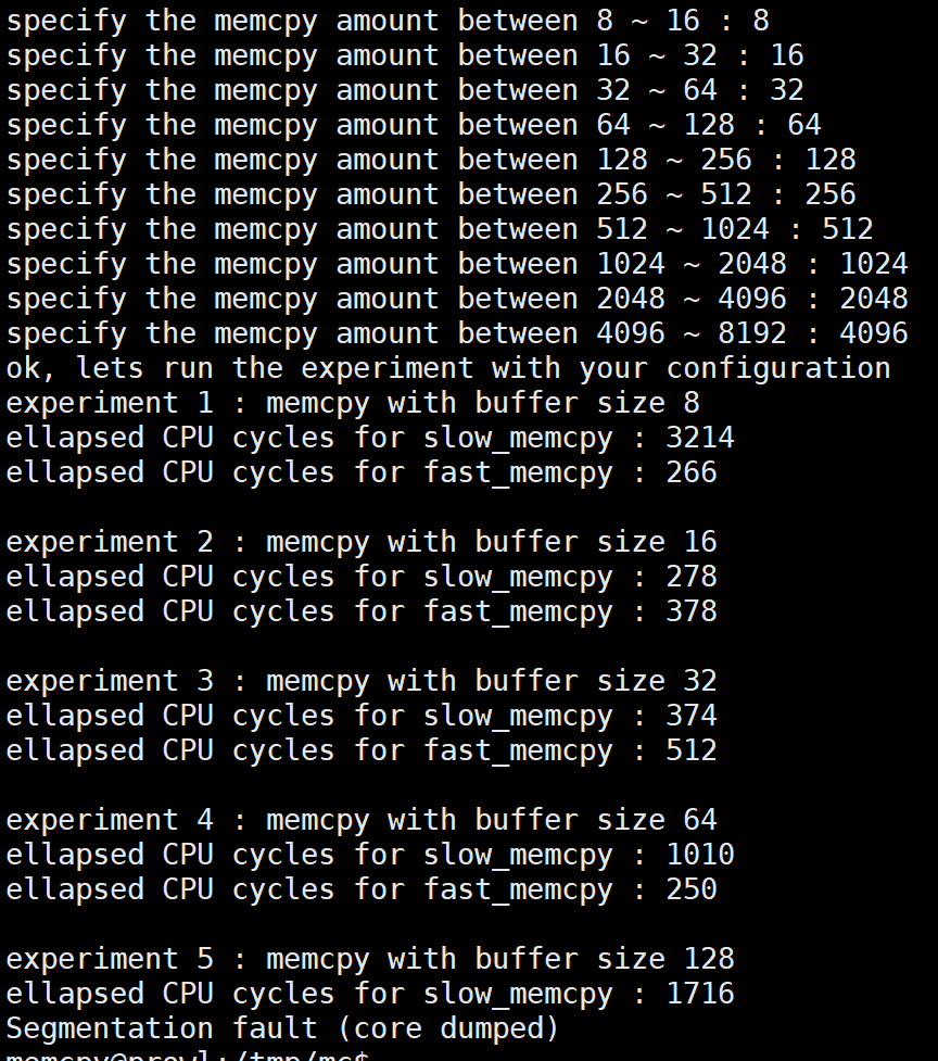 코드에서는 일정 범위의 숫자를 입력 받고, 실험을 한다. memcpy를 입력받은 크기만큼(입력한 바이트만큼) 하는 실험이며, 입력과 실험을 10번 시행한다. slow_memcpy와 fast_memcpy의 성능을 비교하기 위한 실험을 하는 것으로 보인다.