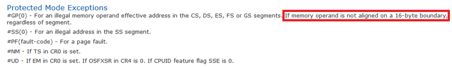 어셈블리어로 짠 부분에서, 복사한 데이터를 목적지에 저장하는 코드에서 에러가 발생한다. movntps 명령어는 16바이트 단위로 정렬된 주소를 요구하는데, malloc의 결과로 얻은 주소가 정렬되어 있지 않기 때문에 에러가 발생했다.