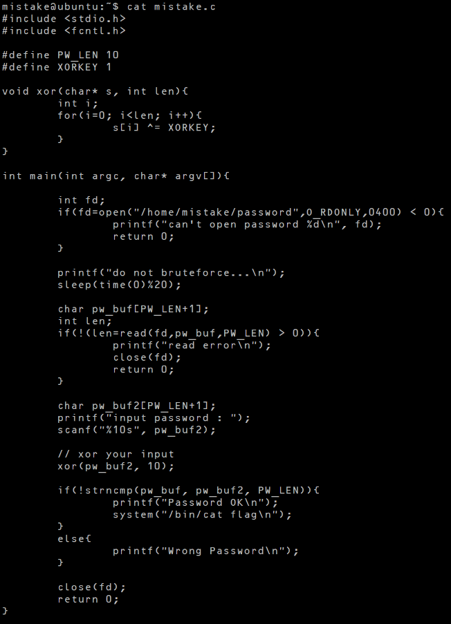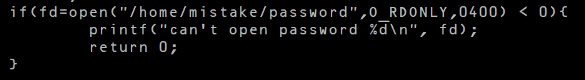 if((fd=open("/home/mistake/password", O_RDONLY, 0400)) < 0) 로 써야 한다.