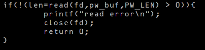 이 코드는 위의 코드에서 생성된 잘못된 fd(0이 저장되어 있음)를 이용하여 read를 하는 코드이다. 파일디스크립터 0번은 STDIN으로 정의되어 있다. 따라서, 이 read 함수는 STDIN에서 데이터를 읽게 된다. password 파일에 무엇이 적혀있든 상관 없다.