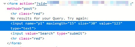 반사된 값은 input 태그의 value에 들어간다. 하지만 이 폼의 maxlength가 15로 정해져 있어 방해한다. HTML을 수정하여 maxlength를 충분히 늘려주고 입력하였다.